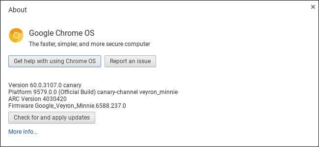Až Chromebook příště zkontroluje aktualizace, stáhne a nainstaluje verzi systému Chrome OS pro kanál Canary. Chcete-li to urychlit, klikněte na nabídku> Nápověda> O systému Chrome OS a klikněte na tlačítko „Zkontrolovat a použít aktualizace“. Po dokončení aktualizace Chromebook restartujte a budete používat kanál Canary.