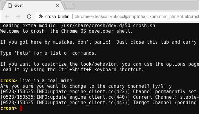 Zadejte „y“ a stisknutím klávesy Enter přepněte na kanál Kanárské ostrovy (znovu, pouze pokud víte, co děláte!). Váš Chromebook se stane jedním z kanárů v uhelném dole a pokud nastane problém s vývojovým kódem systému Chrome OS, bude to jeden z prvních strojů, které se pokazí. O to tu jde! Získáváte nejnovější vývojový kód systému Chrome OS se všemi jeho problémy.
