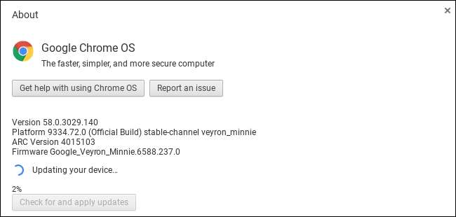 Chromebook se přepne na stabilní kanál a okamžitě začne stahovat a instalovat aktualizaci. Stav stahování můžete zkontrolovat v nabídce> Nápověda> O systému Chrome OS.