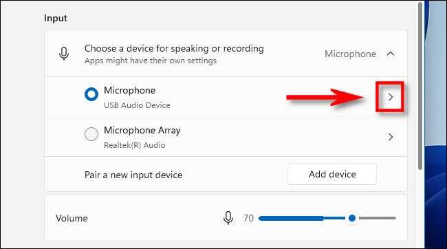 Nastavení systému Windows se otevře systém a GT; Zvuková stránka. Na této stránce přejděte dolů na sekci "Input" a klepněte na karet s bokem (šipka) vedle mikrofonu, který chcete testovat.