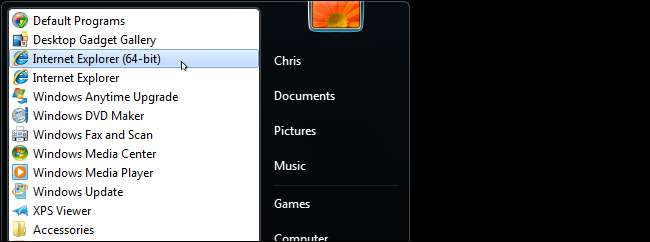 V 64bitové verzi systému Windows 7 uvidíte v nabídce Start dvě různé zkratky. Jeden se jmenuje jednoduše „Internet Explorer“ a uvádí na trh 32bitovou verzi. Druhá zkratka se jmenuje „Internet Explorer (64bitová)“ a spouští 64bitovou verzi.