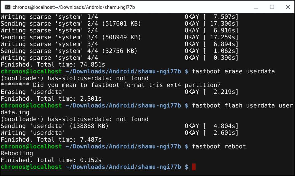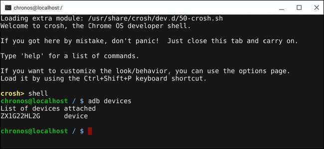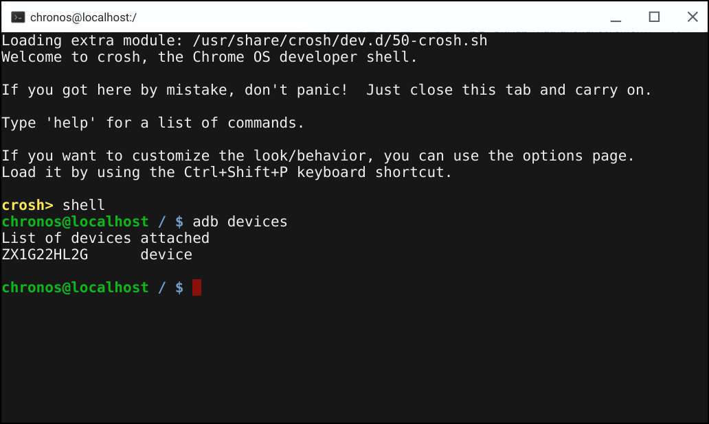 Výzva by se měla změnit na „chronos @ localhost“, poté by ADB i Fastboot měly být k dispozici pro běžné použití.