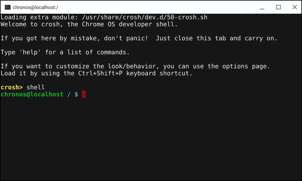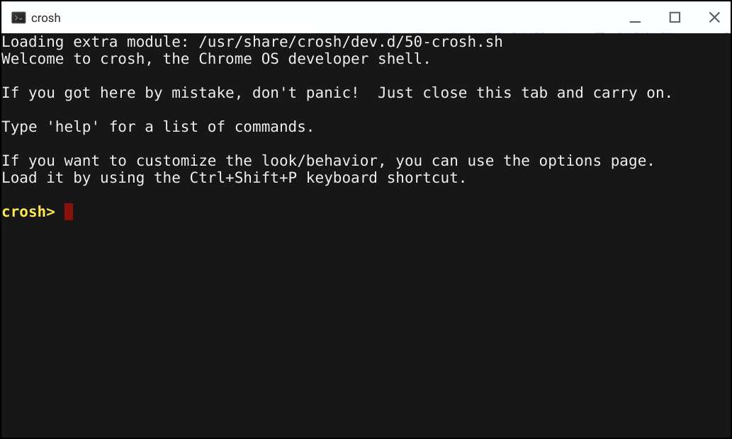 Existuje několik způsobů přístupu k Crosh. Chcete-li jej otevřít v plném okně prohlížeče, stačí stisknout Ctrl + Alt + T na klávesnici.