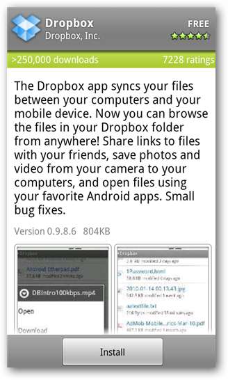 Chcete-li nainstalovat Dropbox do telefonu Android, můžete si jej stáhnout ze služby Android Market nebo nainstalovat naskenováním výše uvedeného QR kódu. Pokud jste v oblasti QR kódů noví, můžete se naučit, jak je používat, v našem příspěvku pomocí QR kódů k instalaci aplikací a sdílení kontaktů do telefonu Android .