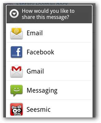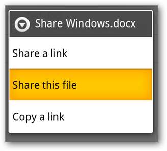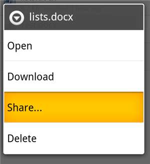 Pomocí nainstalovaných aplikací v telefonu můžete velmi snadno sdílet jakýkoli ze svých dokumentů Dropbox e-mailem, Twitterem, Facebookem nebo rychlou zprávou. Chcete-li soubor sdílet, stiskněte a podržte soubor. Když se zobrazí možnosti, vyberte Sdílet.