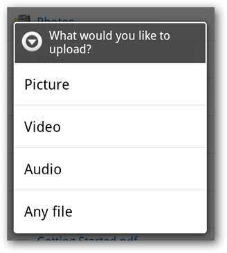 Zobrazí se výzva k výběru typu souboru, který chcete nahrát. Pro náš příklad vybereme video, které jsme dříve natočili a uložili do zařízení.