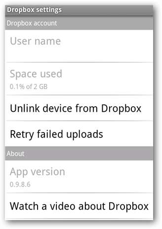 Nastavení Dropboxu (stiskněte Menu a vyberte Nastavení) zobrazí vaše aktuální uživatelské jméno, velikost prostoru použitého ve vašem účtu Dropbox a číslo aktuální verze aplikace. Pokud už zařízení Dropbox nepoužíváte, můžete ho odpojit, a dokonce si můžete prohlédnout krátké úvodní video o Dropboxu.
