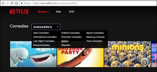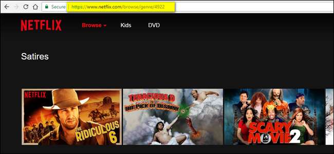Jak tedy přistupujete ke všem kategoriím, které vám Netflix při běžném prohlížení nezobrazuje? Prostřednictvím „žánrových kódů“. Každá žánrová kategorie na Netflixu, bez ohledu na to, jak široká nebo jak zaměřená, má přiřazeno jedinečné číslo. Pokud přejdete například na komediální subgrén „Satiry“, uvidíte žánrový kód pro danou kategorii: