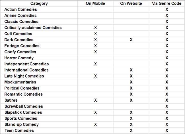 S žánrovými kódy můžeme přejít od přístupu k polovině kategorií komedie k přístupu ke všem. Ještě šílenější je, že výše uvedená tabulka není ani úplným seznamem kategorií komedie Netflixu - je jich tolik, že vložení tabulky by zabralo hodně prostoru v tomto článku.