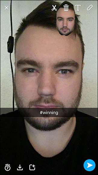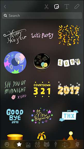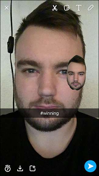 Klepnutím na ikonu Post-It note přidáte do svých snímků samolepky. Mohou to být systémové emodži, bitmoji, samolepky, které si sami vyrobíte, nebo vlastní samolepky vydané Snapchatem.
