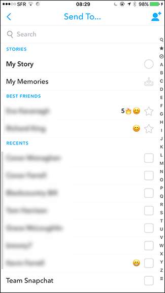 Zde můžete vybrat, komu chcete poslat svůj Snap. Lidé, které nejčastěji kontaktujete a kontaktovali vás naposledy, se zobrazí v horní části seznamu. Klepnutím na jméno kontaktu jej vyberte.