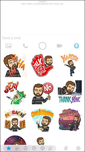 Chcete-li odeslat štítek, klepněte na ikonu emodži zcela vpravo. Můžete posílat všechny systémové emodži, vlastní nálepky Snapchatu a bitmoji.