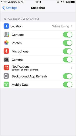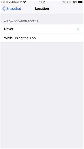 Abychom se ujistili, že Snapchat nemá absolutně žádný přístup k poloze vašeho telefonu, zablokujeme mu jeho používání na systémové úrovni změnou oprávnění aplikace. Máme plné průvodce správa oprávnění aplikace pro iOS a na Androidu , ale zde uvedu krátký přehled.