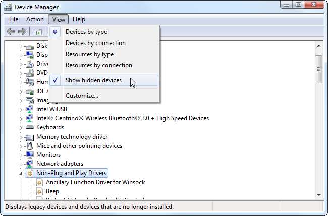 Některá hardwarová zařízení se v tomto seznamu ve výchozím nastavení nezobrazují. Můžete je zobrazit kliknutím na Zobrazit a výběrem Zobrazit skrytá zařízení. Zobrazí se řada „ovladačů bez možnosti plug-and-play“, včetně nízkoúrovňových ovladačů systému Windows a ovladačů nainstalovaných softwarem třetích stran.