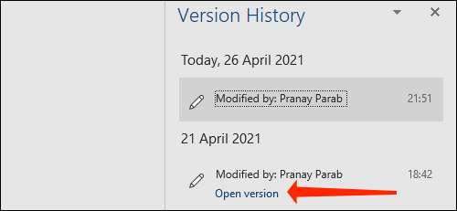Tím se otevře panel Version History na pravé straně. Nejnovější verze dokumentu bude uveden v horní části. Slovo také ochotně seřadí změny podle data, takže je mnohem snazší sledovat starší verze velkých dokumentů.