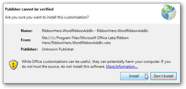 Jakmile nainstalujete Ribbon Hero a otevřete podporovanou aplikaci Office, poprvé se zobrazí upozornění na ověřovací zprávu ... otestovali jsme to a je to bezpečné, takže můžete pokračovat a nechat ji nainstalovat. Při prvním otevření Wordu, Excelu a PowerPointu to budete muset ověřit.