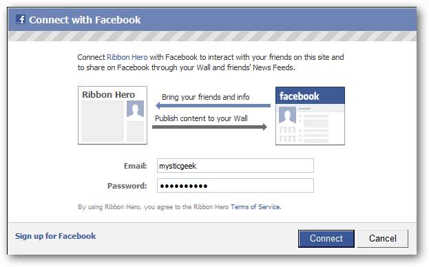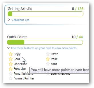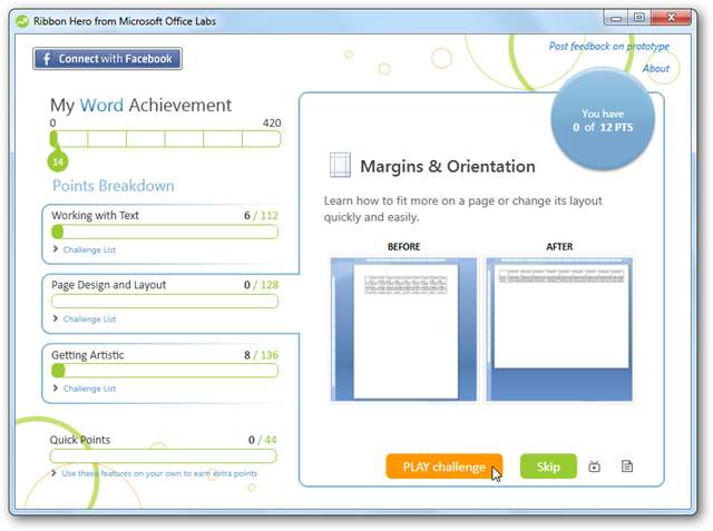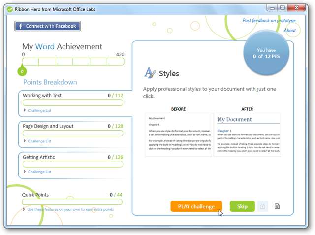 Když zahájíte hru Ribbon Hero, uvidíte, kolik bodů máte, nová výzva (zde vidíme, jak použít styly), Spojte se s Facebookem a rozpis vašich bodů.