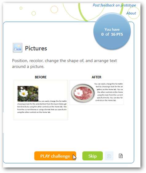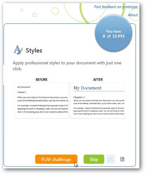 Každá výzva se můžete rozhodnout hrát nebo přeskočit na další. Protože zatím nemáme žádné body, podívejme se na tuto výzvu. Poskytnou vám přehled o tom, co to je, takže zde musíme jedním kliknutím použít profesionální styly dokumentu. Ukáží vám také předchozí a jak to bude vypadat, když to úspěšně změníte.