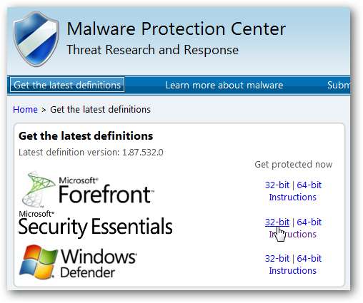 Můžete také přejít do centra Microsoft Malware Protection Center, stáhnout si nejnovější soubory s definicemi a nainstalovat ručně.