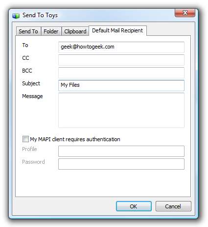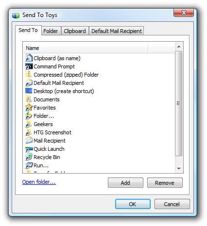První záložka v konfiguračním dialogu je mimořádně užitečná… umožňuje vám přidávat nebo odebírat složky a položky z nabídky Odeslat. Samozřejmě bez nástroje byste to mohli udělat ručně otevřením složky shell: sendto a přetažením, ale je to mnohem jednodušší.