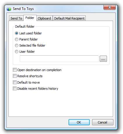 Záložka Složka vám umožňuje nakonfigurovat, která složka je výchozí v položce odeslání „Složka…“ přidané tímto nástrojem (snímky obrazovky níže). Dvě opravdu zajímavé možnosti zde jsou „Otevřít cíl po dokončení“, který otevře složku, do které jste právě odeslali soubor ..., a „Výchozí k přesunu“, což je docela vysvětlující.