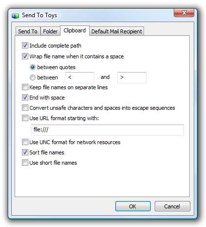 Na kartě Schránka jsou zobrazeny některé skvělé možnosti položky „Odeslat do schránky (jako název)“ ... můžete si vybrat, zda chcete nebo nechcete uvozovky a zda chcete, aby byly soubory odděleny na různých řádcích, pokud odesíláte více souborů do schránky.
