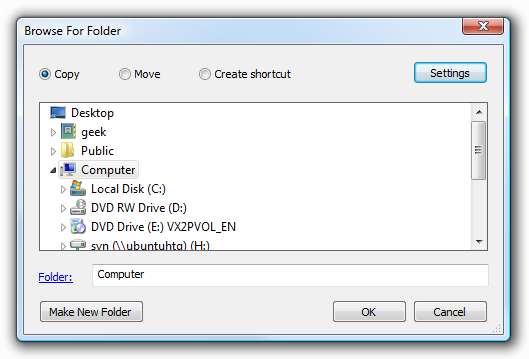 Jednou z nejužitečnějších položek je položka Složka…, která zobrazí dialogové okno umožňující zkopírovat, přesunout nebo jednoduše vytvořit zástupce do souboru.