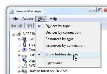 Jakmile jste ve Správci zařízení, přejděte do nabídky Zobrazit a vyberte Zobrazit skrytá zařízení, která zobrazí všechny ovladače zařízení, včetně věcí, které aktuálně ve vašem počítači nejsou nainstalovány.