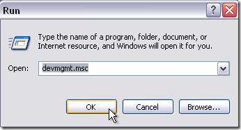 Klikněte pravým tlačítkem na Hardware tohoto počítače Vlastnosti a přejděte do Správce zařízení. Nebo mnohem jednodušší způsob přístupu do Správce zařízení je zadání „Devmgmt.msc“ do řádku spuštění a potom klepněte na OK.