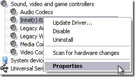 Ve správci zařízení přejděte na zařízení, které se nechová správně. V tomto příkladu použiji integrované zvukové zařízení. Klikněte pravým tlačítkem na zařízení a vyberte Vlastnosti.