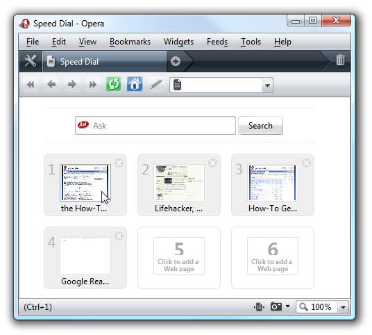 Pokud nejste obeznámeni s Speed Dial Opera, je to velmi užitečná stránka, která vám ukazuje miniatury webů a umožňuje vám rychle na ně přejít pomocí myši nebo klávesnice: