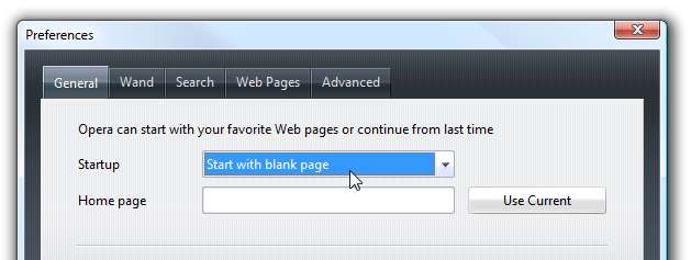 V nabídce otevřete Nástroje \ Předvolby a poté změňte rozevírací nabídku Po spuštění na možnost „Začít s prázdnou stránkou“. (Upozorňujeme, že to zabrání automatickému načtení karet z poslední relace.)
