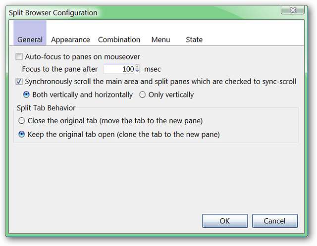 Jakmile nainstalujete rozšíření a restartujete Firefox, je nejlepší začít s dobrým prohlédnutím možností. V části „Obecná oblast“ můžete vybrat předvolby, které požadujete pro automatické zaostřování, synchronní posouvání a chování rozdělené karty.