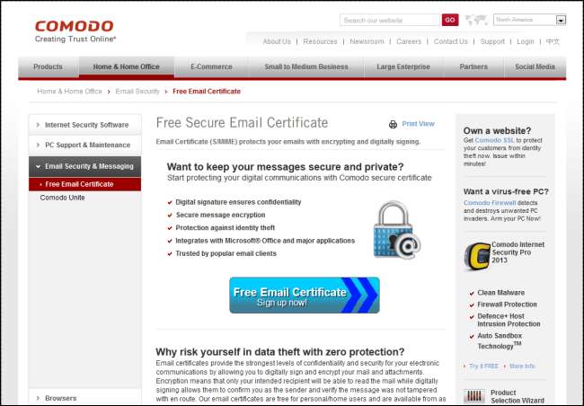 E-mailové certifikáty poskytují nejvyšší úroveň důvěrnosti a zabezpečení vaší elektronické komunikace tím, že vám umožňují digitálně podepisovat a šifrovat vaši poštu a přílohy. Šifrování znamená, že pouze váš zamýšlený příjemce bude moci číst poštu, zatímco digitální podepisování jim umožní potvrdit vás jako odesílatele a ověřit, že zpráva nebyla na cestě narušena. E-mailové certifikáty Comodo jsou zdarma pro osobní / domácí uživatele a jsou k dispozici od pouhých 12 $ ročně firemní uživatelé .