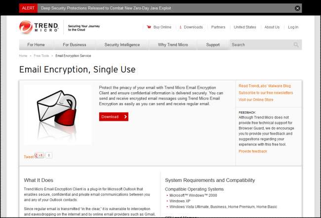 Vzhledem k tomu, že se běžný e-mail přenáší „jasně“, je náchylný k odposlechu a odposlechu na internetu a poskytovateli e-mailů online, jako jsou Gmail, Hotmail a Yahoo! Pošta. Bezpečné, zabezpečené a zdarma pro nekomerční použití zajišťuje klient Trend Micro Email Encryption Client, aby nikdo kromě vás a vašich příjemců nemohl číst vaše šifrované e-mailové zprávy a přílohy.