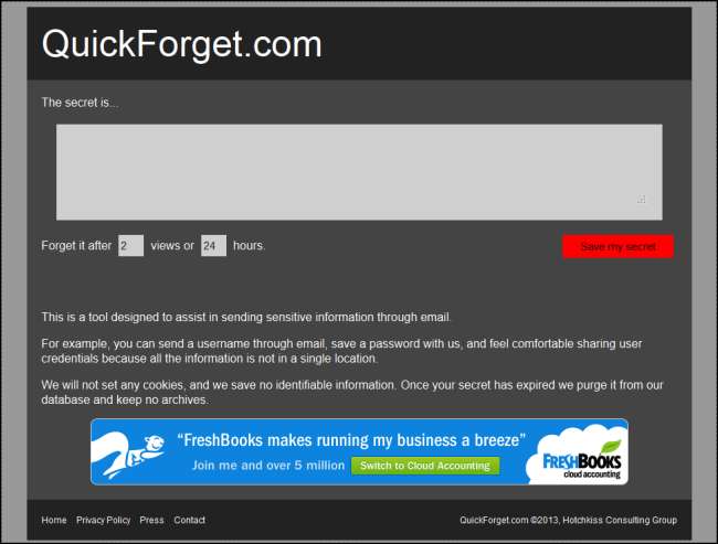 QuickForget.com je bezplatná webová služba, která vám umožňuje sdílet tajné zprávy, které se po stanoveném čase samy zničí. Zadejte zprávu a získejte odkaz, který můžete sdílet s příjemcem zprávy. Můžete nastavit povolený počet zobrazení a také dobu, po kterou se zpráva automaticky zničí. Jakmile je zpráva odstraněna, je navždy pryč. Pokud se pokusíte o přístup ke zprávě po jejím odstranění, zobrazí se zpráva se zprávou „Je nám líto, už jsem zapomněla tajemství.“