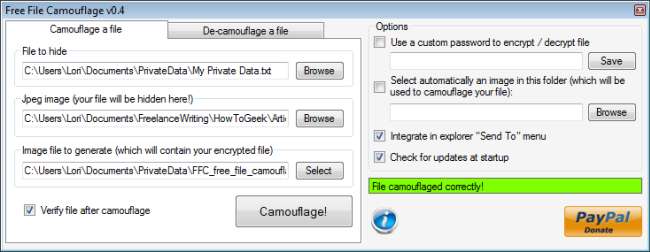 Kamufláž souborů zdarma je bezplatný program, který umožňuje skrýt soubory uvnitř obrázku jpeg. Tento software lze použít s hlavním rozhraním nebo prostřednictvím kontextového menu „odeslat do“ Průzkumníka Windows (poprvé stačí vybrat adresář s některými obrázky).