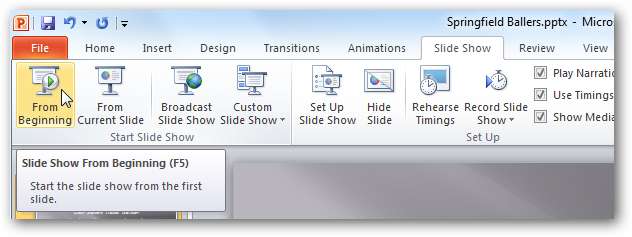 Prezentaci zahájíte stisknutím klávesy F5 nebo výběrem Od začátku nebo Z aktuálního snímku ve skupině Spustit prezentaci na kartě Prezentace.