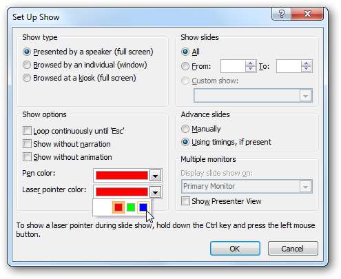 Z rozevíracího seznamu Barva laserového ukazatele můžete vybrat červenou, zelenou nebo modrou a poté kliknout na OK.