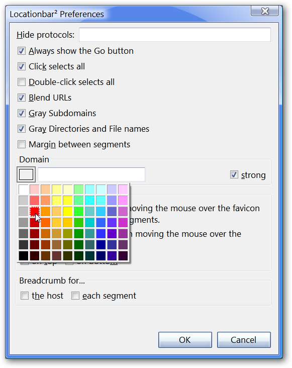 V našem příkladu jsme vybrali možnost „Vždy zobrazit tlačítko Přejít“, abychom měli „Zobrazení názvu domény jako silné“, zvolili jsme vlastní barvu názvu domény, aby ještě lépe vynikli nad zbytkem adresy webových stránek, a nadále umožňovat, aby části subdomény adresy zůstaly šedé.