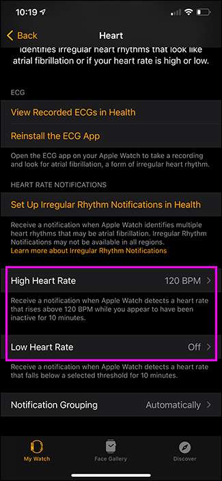 V každém hodině, která má, může senzor optického tepová frekvence detekovat, pokud máte abnormálně vysokou nebo nízkou tepovou frekvenci. Ve výchozím nastavení, pokud vaše tepová frekvence zůstane nad 120 bpm po 10 minutách nečinnosti nebo klesne pod 40 bpm po dobu 10 minut, získáte oznámení.