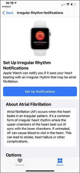 Musíte také umožnit nepravidelnou detekci tepové frekvence. Chcete-li tak učinit, otevřete aplikaci pro zdraví na vašem iPhone, jděte do srdce & gt; Nepravidelná rytmická oznámení a potom klepněte na položku "Nastavit oznámení." Poté budete mít nějaké informace, abyste mohli potvrdit, že je vhodné pro vás.