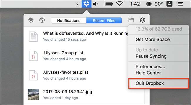 Pokud opravdu chcete zavřít dbfseventsd, musíte zavřít Dropbox. Klikněte na ikonu na liště nabídek, poté na ikonu ozubeného kola v okně, které se objeví, a poté klikněte na „Ukončit Dropbox“.