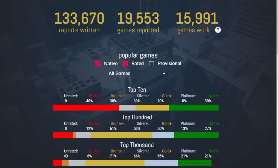 Chcete-li zjistit, jaké hry jsou v současné době podporována, zamiřte do Oficiální internetové stránky ProtonDB . V době psaní tohoto, více než 77% z vrcholu 1000 hry jsou hratelné pomocí proton, v nichž více než 21% nativní provoz (nevyžadují Proton), 21% jsou hodnoceny Platinum (běh po vybalení z krabice), 56% (Gold běžet po vylepšení), 66% Silver (běh s otázkami drobné a vylepšení), a 71% Bronze (běh, ale dojít k selhání často).
