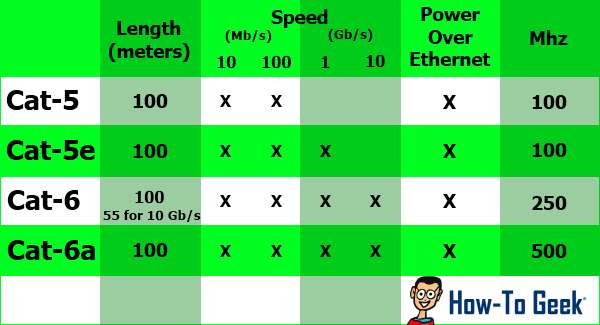 Rozdíly ve specifikacích kabelů není tak snadné pochopit jako fyzické změny; podívejme se tedy na to, co jednotlivé kategorie dělají a nepodporují. Níže je uveden referenční diagram při výběru kabelu pro vaši aplikaci na základě standardů pro danou kategorii.