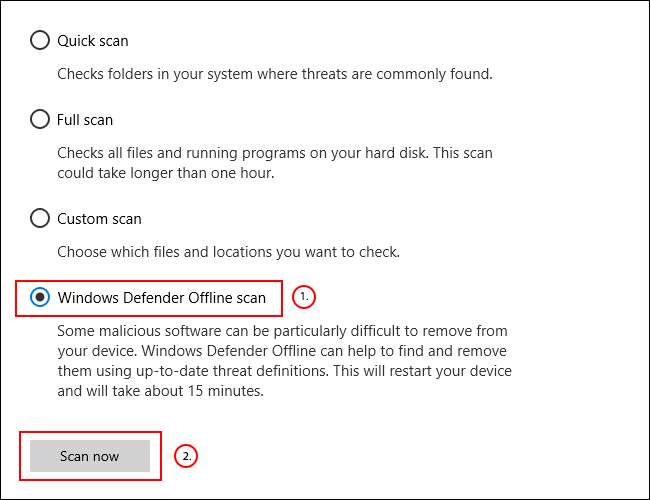 V nabídce „Možnosti skenování“ vyberte možnost „Windows Defender Offline skenování“.