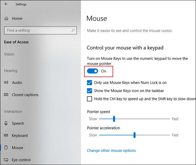 Chcete-li to povolit, přejděte do nastavení systému Windows kliknutím pravým tlačítkem na nabídku Start a kliknutím na „Nastavení“. Odtud klikněte na Usnadnění přístupu> Myš a poté kliknutím na posuvník do polohy „Zapnuto“ aktivujte MouseKeys.