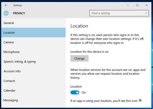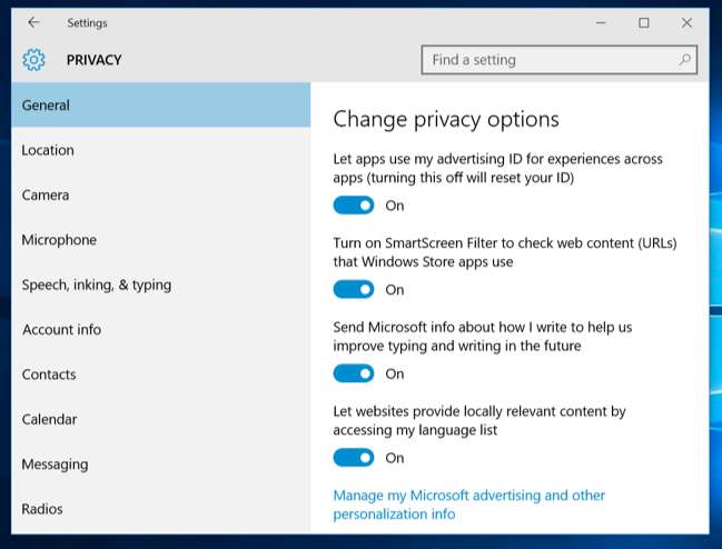 Du finder mange af disse funktioner under Privatliv i den nye appen Indstillinger . (Klik på Start-knappen, klik på Indstillinger, og vælg Privatliv.) Nogle af mulighederne her styrer blot hvilke apps der har adgang til forskellige data - for eksempel hvilke apps der kan styre dit webcam. Andre giver dig mulighed for at indstille privatlivsindstillinger for hele systemet.