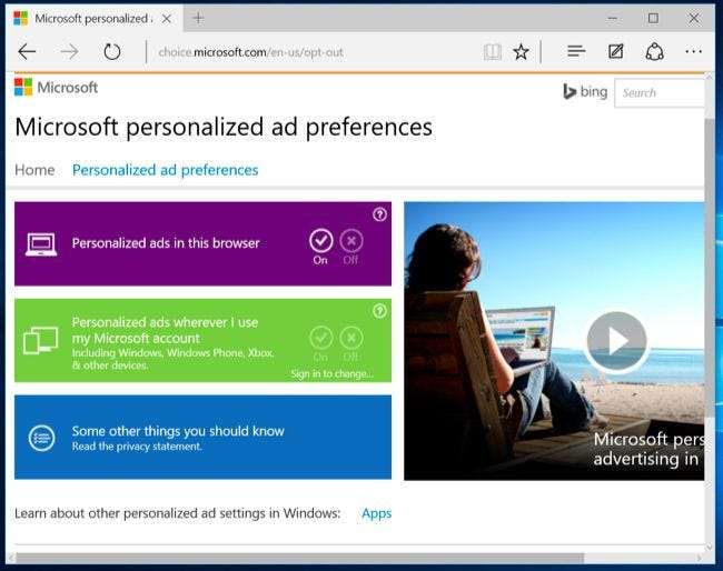 Du ser linket "Administrer mine Microsoft-annoncer og andre personaliseringsoplysninger" nederst her. Klik på den, og klik derefter over til "Personaliserede annonceindstillinger" på den webside, der vises. Du kan også få adgang til denne side på https://choice.microsoft.com/en-us/opt-out .