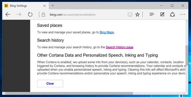 - 9. Tale, blæk og skrivning i skyen - Klik på "Gå til Bing og administrer personlig information for alle dine enheder" for at rydde personaliseringsdata, der er gemt på Microsofts servere, der er bundet til din Microsoft-konto. Dette link fører dig til https://bing.com/account/personalization side. Brug knappen "Ryd" under "Andre Cortana-data og personlig tale, blæk og skrivning" for at rydde disse data.